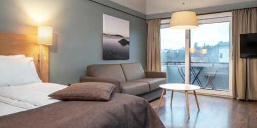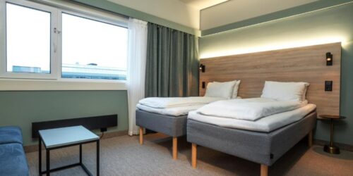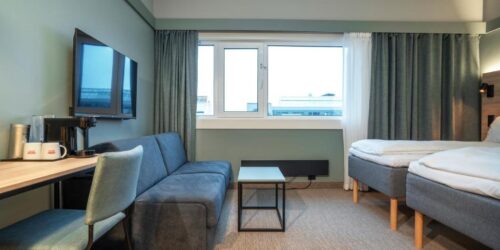 Alle rommene på Thon Hotel Kristiansand har skrivebord og eget bad med dusj. Noen av rommene kan også skilte med balkong.