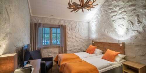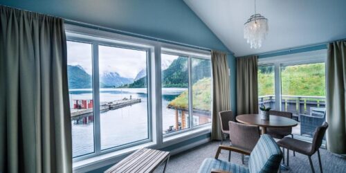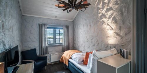 Alle rommene på Sagafjord Hotel har moderne design og eget bad. Rommene har innredning med rolige farger og tremøbler som står i stil med naturen rundt hotellet.