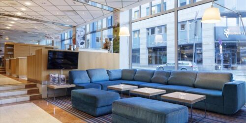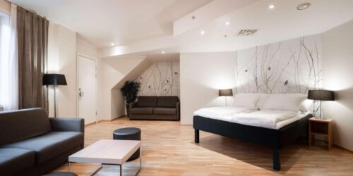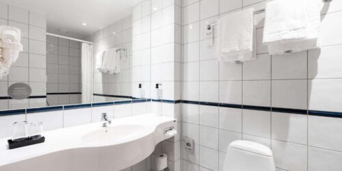 Alle de fargerike rommene på Scandic Byparken er utstyrt med minibar og eget bad med dusj og hårføner.